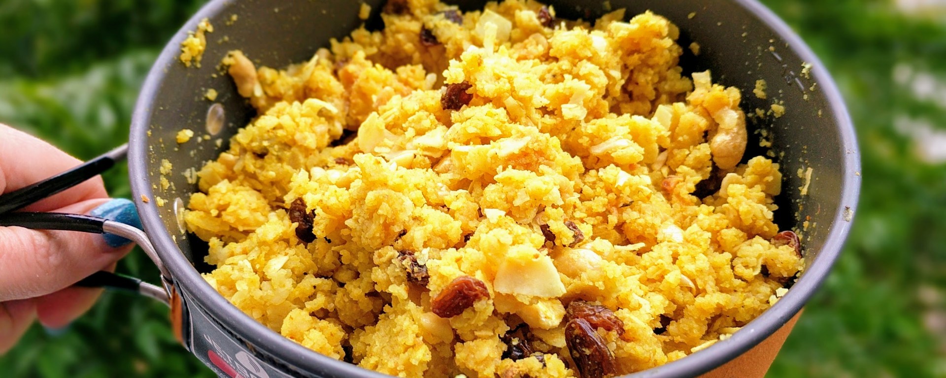 In this meat-free recipe I add boiling water to the rice and other flavors to give a warm, comforting post-hike meal.